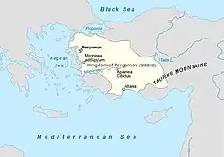 During the Hellenistic period, it became the capital of the Kingdom of Pergamon in 281–133 BC under the Attalid dynasty, who transformed it into one of the major cultural centres of the Greek world. The remains of many of its monuments are still visible today, most notably the masterpiece of the Pergamon Altar.[2] Pergamon was the northernmost of the seven churches of Asia cited in the New Testament Book of Revelation.[3]