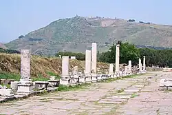 The earliest mention of Pergamon in literary sources comes from Xenophon's Anabasis, since the march of the Ten Thousand under Xenophon's command ended at Pergamon in 400/399 BC.[8] Xenophon, who calls the city Pergamos, handed over the rest of his Greek troops (some 5,000 men according to Diodorus) to Thibron, who was planning an expedition against the Persian satraps Tissaphernes and Pharnabazus, at this location in March 399 BC. At this time Pergamon was in the possession of the family of Gongylos from Eretria, a Greek favourable to the Achaemenid Empire who had taken refuge in Asia Minor and obtained the territory of Pergamon from Xerxes I, and Xenophon was hosted by his widow Hellas.[9]