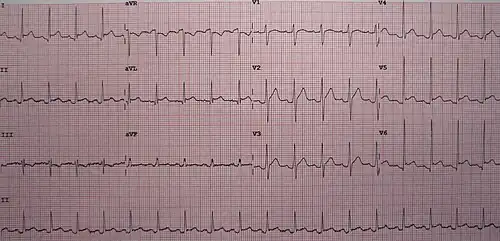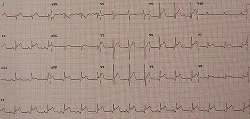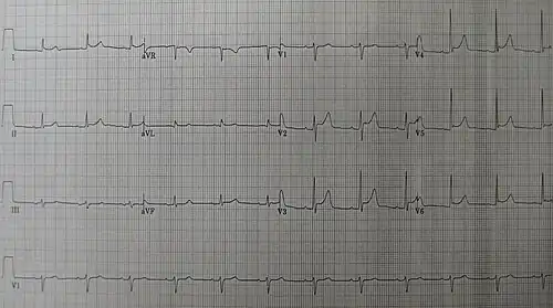 | An ECG showing pericarditis, with ST elevation in multiple leads and slight reciprocal ST depression in aVR. | |