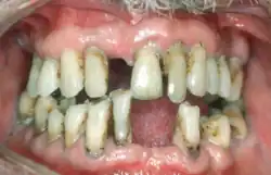 Treatment involves good oral hygiene and regular professional teeth cleaning.[5] Recommended oral hygiene include daily brushing and flossing.[5] In certain cases antibiotics or dental surgery may be recommended.[12] Clinical investigations demonstrate that quitting smoking and making dietary changes enhance periodontal health.[13][14] Globally, 538 million people were estimated to be affected in 2015 and has been known to affect 10–15% of the population generally.[7][8][6] In the United States, nearly half of those over the age of 30 are affected to some degree and about 70% of those over 65 have the condition.[5] Males are affected more often than females.[5]