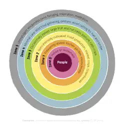 Zones intelligently organize design elements in a human environment based on the frequency of human use and plant or animal needs. Frequently manipulated or harvested elements of the design are located close to the house in zones 1 and 2. Manipulated elements located further away are used less frequently. Zones are numbered from 0 to 5 based on positioning.[33]