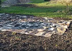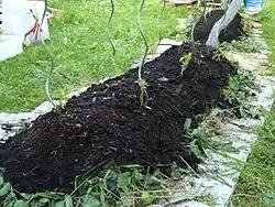 Hügelkultur is the practice of burying wood to increase soil water retention. The porous structure of wood acts like a sponge when decomposing underground. During the rainy season, sufficient buried wood can absorb enough water to sustain crops through the dry season.[37][38][39] This technique is a traditional practice that has been developed over centuries in Europe and has been recently adopted by permaculturalists.[40] The Hügelkultur technique can be implemented through building mounds on the ground as well as in raised garden beds. In raised beds, the practice "imitates natural nutrient cycling found in wood decomposition and the high water-holding capacities of organic detritus, while also improving bed structure and drainage properties." This is done by placing wood material (e.g. logs and sticks) in the bottom of the bed before piling organic soil and compost on top. A study comparing the water retention capacities of Hügel raised beds to non-Hügel beds determined that Hügel beds are both lower maintenance and more efficient in the long term by requiring less irrigation.[41]