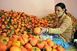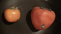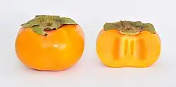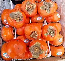 Oriental persimmon, Chinese persimmon or Japanese persimmon[7] (Diospyros kaki) is the most commercially important persimmon. It is native to China, Northeast India and northern Indochina.[8][9] It was first cultivated in China more than 2,000 years ago, and introduced to Japan in the 7th century and to Korea in the 14th century.[10] China, Japan and South Korea are also the top producers of persimmon. It is known as shi (柿) in Chinese, kaki (柿) in Japanese and gam (감) in Korean and also known as Korean mango. It is known as haluwabed (हलुवाबेद) in Nepal and it is used for various culinary purposes and eaten as a seasonal fruit. In Nepal, it is one of the most popular fruits and has been consumed for a long time. It was introduced to California and southern Europe in the 1800s and to Brazil in the 1890s, in the State of São Paulo, afterwards spreading across Brazil with Japanese immigrants; the State of São Paulo is still the greatest producer within Brazil, with an area of 3,610 hectares (8,900 acres) dedicated to persimmon culture in 2003;[11] It is deciduous, with broad, stiff leaves. Its fruits are sweet and slightly tangy with a soft to occasionally fibrous texture.