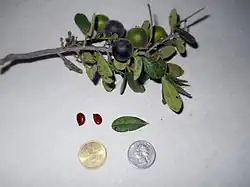 Texas persimmon (Diospyros texana) is native to central and west Texas and southwest Oklahoma in the United States, and eastern Chihuahua, Coahuila, Nuevo León, and Tamaulipas in northeastern Mexico. The fruit of D. texana are black, subglobose berries with a diameter of 1.5–2.5 cm (58–1 in) that ripen in August.[24] The fleshy berries become edible when they turn dark purple or black, at which point they are sweet and can be eaten from the hand or made into pudding or custard.[25]