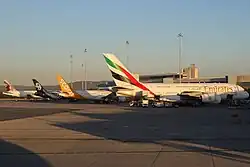 In May 2015, Emirates commenced the first Airbus A380 service to Perth from Dubai following the completion of a dual level boarding gate, an expanded check-in hall, a refurbished departure area and other expansions to terminal 1 including a new Emirates business class lounge.[30][31] In August 2017, Emirates replaced its last remaining Emirates Boeing 777-300ER service with an Airbus A380, taking the total Emirates daily services to two.[32] However, this service was replaced by a Boeing 777 in 2020, during the COVID-19 pandemic. On 1 November 2022, the first regular A380 service resumed.