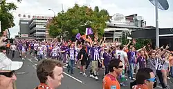 Perth's home kit as of the 2020–21 season is mainly purple, with orange stripes on the collar and arms. The kit also consists of purple shorts with orange trimming and purple socks. The away kit consists of a white jersey with orange and purple stripes throughout, including on the collar and arms, and a large purple strip behind the BHP sponsorship in the middle of the kit. The shorts are white with orange and purple trimming and the socks are white.[199] In what was seen as something of a tribute to Glory's past, the strip used for the 2009–10 season had vertical stripes, similar to what can be found on Glory's jersey of 1996–97.[200] On 23 October 2011, Perth Glory wore a predominantly blue jersey in recognition of the 125-year anniversary of their major sponsor, QBE Insurance, in a match against Wellington Phoenix.[201]