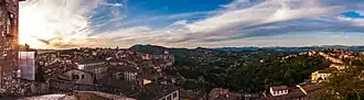 Perugia (/pəˈruːdʒə/pə-ROO-jə,[3][4]US also /-dʒiə,peɪˈ-/-jee-ə, pay-;[5]Italian:[peˈruːdʒa]ⓘ; Latin: Perusia) is the capital city of Umbria in central Italy, crossed by the River Tiber. The city is located about 164 km (102 mi) north of Rome and 148 km (92 mi) southeast of Florence. It covers a high hilltop and part of the valleys around the area. It has 162,467 inhabitants as of 2025.[2]