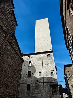 Torre degli SciriSciri's tower[45] (XIII century), the most well known among the remaining towers in Perugia. It takes its name from the Sciri family and is the only control tower on the noble blocks that still stands. Standing at 42 meters tall and featuring a square shape, it has recently undergone a renovation that has restored its ancient hues, including the distinctive color of the building stone. In 1680, the tower was incorporated into the Convent of the Franciscan Tertiaries of Sister Lucia.