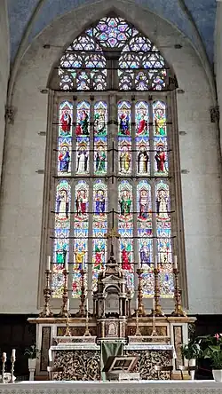 The stained glass window of the Basilica of San Domenico (1411)San Domenico: Basilica church of the Dominican order, building began in 1394 and finished in 1458. Before 1234, this site housed markets and a horse fair. The exterior design attributed to Giovanni Pisano, while its interior redecorated in Baroque fashion by Carlo Maderno. The massive belfry was partially cut around the mid-16th century. The interior hosts the splendid tomb of Pope Benedict XI and a wooden choir from the Renaissance period. The 23 m × 8 m (75 ft × 26 ft) stained glass window of the Basilica of San Domenico is one of the largest in the world.