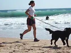 Woman jogging with a dog at Carcavelos beach, Portugal