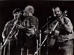 In 1950, the Almanacs were reconstituted as the Weavers, named after the title of an 1892 play by Gerhart Hauptmann, about a workers' strike (which contained the lines "We'll stand it no more, come what may!"). They did benefits for strikers, at which they sang songs such as "Talking Union", about the struggles for unionisation of industrial workers such as miners and automobile workers.[44] Besides Pete Seeger (performing under his own name), members of the Weavers included charter Almanac member Lee Hays, Ronnie Gilbert, and Fred Hellerman; later Frank Hamilton, Erik Darling, and Bernie Krause serially took Seeger's place. In the atmosphere of the 1950s red scare, the Weavers' repertoire had to be less overtly topical than that of the Almanacs had been, and its progressive message was couched in indirect language. The Weavers on occasion performed in tuxedos (unlike the Almanacs, who had dressed informally) and their managers refused to let them perform at political venues. The Weavers' string of major hits began with "On Top of Old Smoky" and an arrangement of Lead Belly's signature waltz, "Goodnight, Irene",[4] which topped the charts for 13 weeks in 1950,[10] and was covered by many other pop singers. On the flip side of "Irene" was the Israeli song "Tzena, Tzena, Tzena".[4] Other Weavers hits included "Dusty Old Dust" ("So Long It's Been Good to Know You" by Woody Guthrie), "Kisses Sweeter Than Wine" (by Hays, Seeger, and Lead Belly), and the Zulu song by Solomon Linda, "Wimoweh" (about Shaka), among others.
