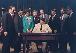 Convinced by Japanese-American farmers in the Central Valley to support redress, Wilson co-sponsored the Civil Liberties Act of 1988. The bill was signed into law by President Reagan.[16]
