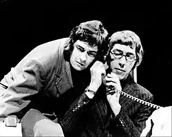 Cook first came to prominence in his own right in the satirical stage show Beyond the Fringe, alongside Jonathan Miller, Alan Bennett, and Dudley Moore.[15] Beyond the Fringe became a great success in London after being first performed at the Edinburgh Festival in 1960, and included Cook impersonating the prime minister, Harold Macmillan. This was one of the first occasions satirical political mimicry had been attempted in live theatre, and it shocked audiences. During one performance, Macmillan was in the theatre and Cook departed from his script and attacked him verbally.[16]