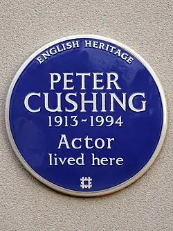The Cushing family lived in Dulwich during the First World War, but moved to Purley after the war ended in 1918.[5] Although raised during wartime, Cushing was too young to understand or become greatly affected by it, and was shielded from the horrors of war by his mother, who encouraged him to play games under the kitchen table whenever the threat of possible bombings arose.[3] In his infancy, Cushing twice developed pneumonia and once what was then known as "double pneumonia". The latter was often fatal during that period, although he survived.[5] During one Christmas in his youth, Cushing saw a stage production of Peter Pan, which served as an early source of inspiration and interest in acting.[6] Cushing loved dressing up and make believe from an early age, and later claimed he always wanted to be an actor, "perhaps without knowing at first."[7] A fan of comics and toy collectibles in his youth, Cushing earned money by staging puppet shows for family members with his glove-puppets and toys.[8]