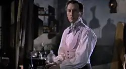 Cushing struggled greatly to find work over the next few years, and became so stressed that he felt he was suffering from an extended nervous breakdown.[34] Nevertheless, he continued to appear in several small roles in radio, theatre and film.[10][35] Among them was the John Huston film Moulin Rouge (1952) in which he played a racing spectator named Marcel de la Voisier appearing with José Ferrer, who played the artist Henri de Toulouse-Lautrec.[21] During this discouraging period for Cushing, his wife encouraged him to seek roles in television, which was beginning to develop in England.[10] She suggested he should write to all the producers listed in the Radio Times magazine seeking work in the medium. The move proved to be a wise one, as Cushing was hired to complement the cast of a string of major theatre successes that were being adapted to live television. The first was J.B. Priestley's Eden End, which was televised in December 1951. Over the next three years, he became one of the most active and favoured names in British television,[10][15][35] and was considered a pioneer in British television drama.[21][28]