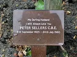 A private funeral service was held at Golders Green Crematorium on 26 July, conducted by Sellers's old friend, Canon John Hester.[265] Sellers's final joke was the playing of "In the Mood" by Glenn Miller, a tune which all the Goons hated; he knew they would have to sit there in silence and listen to it.[273] A memorial service was held at St Martin-in-the-Fields on 8 September 1980—what would have been Sellers's 55th birthday.[274] Close friend Lord Snowdon read the twenty-third Psalm, Harry Secombe sang "Bread of Heaven", and the eulogy was read by David Niven.[274]