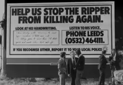 Despite forensic evidence, police efforts were diverted for several months following the receipt of a taped message purporting to be from the murderer, taunting Assistant Chief Constable George Oldfield of the West Yorkshire Police, who was leading the Ripper investigation. The tape contained a man's voice saying, "I'm Jack. I see you're having no luck catching me. I have the greatest respect for you, George, but Lord, you're no nearer catching me now than four years ago when I started."[55] Based on the recorded message, police began searching for a man with a Wearside accent, which linguists narrowed down to the Castletown area of Sunderland, Tyne and Wear. The hoaxer, dubbed "Wearside Jack," sent two letters to police and the Daily Mirror in March 1978 boasting of his crimes. The letters, signed "Jack the Ripper," claimed responsibility for the November 1975 murder of 26-year-old Joan Harrison in Preston.