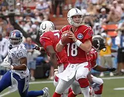 Manning went to Isidore Newman School in New Orleans, Louisiana, where he led the Greenies football team to a 34–5 record during his three seasons as the starter. He passed for 7,207 yards and 92 touchdowns and rushed for 13 touchdowns while leading the Greenies to the postseason all three years.[22] He was named Gatorade Circle of Champions National Player-of-the-Year and Columbus (Ohio) Touchdown Club National Offensive Player-of-the-Year in 1993.[23] While at Newman, he began wearing the #18 jersey in honor of his older brother Cooper, who had to give up football due to spinal stenosis.[24] Younger brother Eli also wore the number when he became starting quarterback. Newman has since retired the #18 jersey and it can be seen hanging in the school gym.[25] Manning was among the most sought-after high school players in the country and was recruited by about 60 colleges, including Florida, Florida State, LSU, Michigan, Tennessee, Texas, Texas A&M, and his father's alma mater Ole Miss.[26] While in high school, Manning played basketball and baseball in addition to football.[22]