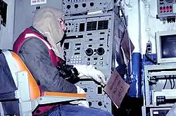 A sailor sits at a CIWS Local Control Panel (LCP) during a general quarters drill.