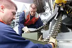 U.S. Navy sailors load tungsten ammunition (white sabots at right) and offload dummy ammunition (left).