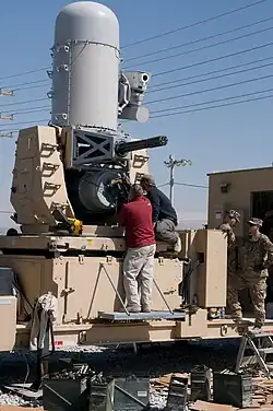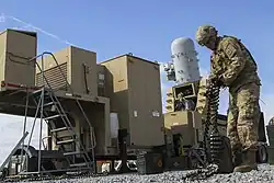 A land variant, the LPWS (Land Phalanx Weapon System), part of the Counter Rocket, Artillery, and Mortar (C-RAM) system, was developed.[6] It was deployed to counter rocket, artillery and mortar attacks during the 2021 US withdrawal from Afghanistan.[7][8] The U.S. Navy also fields the SeaRAM system, which pairs the RIM-116 Rolling Airframe Missile with sensors based on the Phalanx.