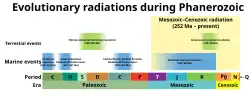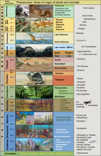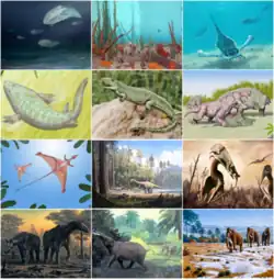 ![]() Fauna and flora from each of the twelve periods of the Phanerozoic. From top left: Cambrian, Ordovician, Silurian, Devonian, Carboniferous, Permian, Triassic, Jurassic, Cretaceous, Paleogene, Neogene, and Quaternary species. | ||||||
