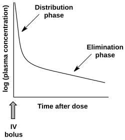 • Multiphasic absorption: Drugs injected intravenously are removed from the plasma through two primary mechanisms: (1) Distribution to body tissues and (2) metabolism + excretion of the drugs. The resulting decrease of the drug's plasma concentration follows a biphasic pattern (see figure).