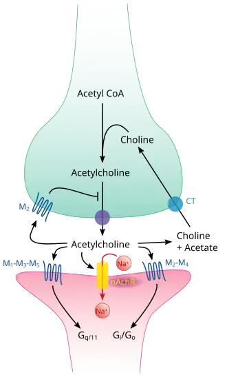 The cholinergic synapse. Targets in synapses can be modulated with pharmacological agents. In this case, cholinergics (such as muscarine) and anticholinergics (such as atropine) target receptors; transporter inhibitors (such as hemicholinium) target membrane transport proteins and anticholinesterases (such as sarin) target enzymes.