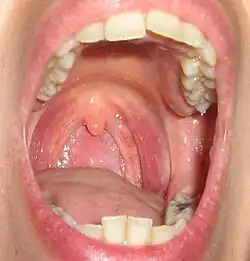 Some cases of pharyngitis are caused by fungal infection, such as Candida albicans, causing oral thrush.[26]