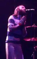 During this period Collins participated in the songwriting jams which produced much of Genesis's material, but did little independent songwriting compared to the other four members.[62] Collins's more notable songwriting contributions during 1970-75 include composing the staccato rhythm which acts as the main theme of the live favourite "Watcher of the Skies".[63] His first album as a member, Nursery Cryme, features the acoustic song "For Absent Friends" that has Collins singing lead vocal. He sang "More Fool Me" on their 1973 album Selling England by the Pound[64] and on the subsequent tour, marking the first time he assumed the role of Genesis lead vocalist in a live setting.[65] In 1974, Collins played drums on Brian Eno's second album Taking Tiger Mountain (By Strategy) after Eno had contributed electronic effects to two songs on The Lamb Lies Down on Broadway.[66]