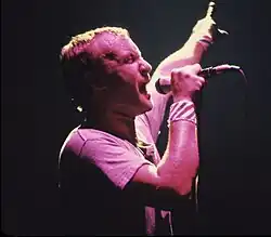 Following an invitation by record producer Martin Lewis, Collins performed live as a solo artist at an Amnesty International benefit show The Secret Policeman's Other Ball at the Theatre Royal, Drury Lane in London in September 1981, performing "In the Air Tonight" and "The Roof Is Leaking".[86] Collins worked again with John Martyn in this year, producing his album Glorious Fool.[87] In September 1981, Genesis released Abacab. This was followed by its 1981 supporting tour and a two-month tour in 1982 promoting the Genesis live album Three Sides Live. In early 1982, Collins produced and played on Something's Going On, the third solo album by Anni-Frid Lyngstad of ABBA,[88] and performed most of the drum parts on Pictures at Eleven, the first solo album by Led Zeppelin singer Robert Plant.[89] In October 1982, Collins took part in the one-off Genesis reunion concert Six of the Best held at the Milton Keynes Bowl in Buckinghamshire, which marked the return of Gabriel on lead vocals and Hackett on guitar.[90]