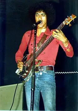 During the band's early years – and despite being the singer, bassist and chief songwriter – Lynott was still fairly reserved and introverted on stage, and would stand to one side while the spotlight concentrated on Bell, who was initially regarded as the group's leader.[29] During the recording of the band's second album, Shades of a Blue Orphanage (1972), Lynott very nearly left Thin Lizzy to form a new band with Deep Purple's Ritchie Blackmore and Ian Paice, called Baby Face. "Ritchie turned up in the studio one day to jam," recalled Downey. "I was asked to play drums to Phil and Ritchie jamming… Me and Eric looked at each other like, 'Well, that's the end of the band then.' It lasted a week, then Phil came back as if nothing had happened. He wanted to be the leader of his own band, not the singer in someone else's."[30] Due to being in dire financial straits Lizzy did, however, soon record an album of Deep Purple covers under the name Funky Junction. Lynott did not sing on the album as he felt his voice was not in the same style as Ian Gillan.[31]