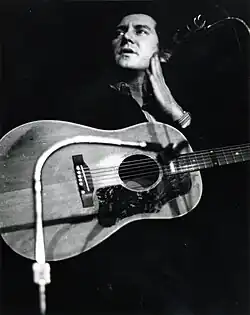 Ochs described himself as a "singing journalist",[39] saying he built his songs from stories he read in Newsweek.[40] By the summer of 1963, he was sufficiently well known in folk circles to be invited to sing at the Newport Folk Festival, where he performed "Too Many Martyrs" (co-written with Bob Gibson), "Talking Birmingham Jam", and "Power and the Glory"—his patriotic Guthrie-esque anthem that brought the audience to its feet. Other performers at the 1963 folk festival included Peter, Paul and Mary, Joan Baez, Bob Dylan, and Tom Paxton.[41] Ochs' return appearance at Newport in 1964, where he performed "Draft Dodger Rag", "Talking Vietnam Blues", and other songs, was widely praised.[42] However, he was not invited to appear in 1965, the festival when Dylan famously performed "Maggie's Farm" with an electric guitar. Although many in the folk world decried Dylan's choice, Ochs admired Dylan's courage in defying the folk establishment, and publicly defended him.[43][44]