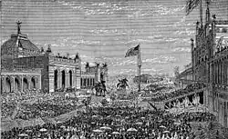 Immigrants, mostly from Ireland and Germany, settled in Philadelphia and the surrounding districts. These immigrants were largely responsible for the first general strike in North America in 1835, in which workers in the city won the ten-hour workday. The city was a destination for thousands of Irish immigrants fleeing the Great Famine in the 1840s; housing for them was developed south of South Street and later occupied by succeeding immigrants. They established a network of Catholic churches and schools and dominated the Catholic clergy for decades. Anti-Irish, anti-Catholic nativist riots erupted in Philadelphia in 1844. The rise in population of the surrounding districts helped lead to the Act of Consolidation of 1854, which extended the city limits from the 2 square miles (5.2 km2) of Center City to the roughly 134 square miles (350 km2) of Philadelphia County.[60][61] In the latter half of the 19th century and leading into the 20th century, immigrants from Russia, Eastern Europe, and Italy, and African Americans from the southern U.S. settled in the city.[62]
