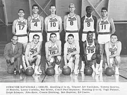 Prior to the 1948–49 season, four teams left the NBL for the BAA as the foundation for a merger was laid.[9] The Nationals "recipe for success" began by recruiting Leo Ferris.[10] Staying in the NBL, Ferris signed Al Cervi to be player-coach and outbid the New York Knicks for the services of Dolph Schayes who made his professional debut,[11] leading the Nationals to a winning record for the first time with a record of 40–23. In the playoffs the Nationals defeated the Hammond Calumet Buccaneers, winning the series in two straight games. In the semifinals, the Nationals lost to the Anderson Duffey Packers for the second straight season in four games. In 1949, when the NBL and the BAA merged into the NBA, the Nationals were one of seven NBL teams that were brought into the NBA. From 1949 to 1956, the team would wear gold on their "Nats" home jersey while wearing gold "Syracuse" jerseys from 1953 to 1956.