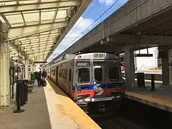 An outbound SEPTA Airport Line train at the Terminal A station, one of four SEPTA stops at the airport