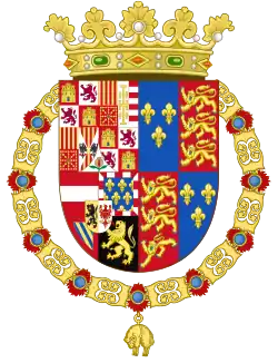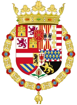A member of the House of Habsburg, Philip was the son of Emperor Charles V, who was also king of Castile and Aragon, and Isabella of Portugal. He was born in the Castilian capital of Valladolid on 21 May 1527 at Palacio de Pimentel,[2] which was owned by Don Bernardino Pimentel (the first Marqués de Távara). The culture and courtly life of Castile were an important influence in his early life. He was entrusted to the royal governess Leonor de Mascareñas, and tutored by Juan Martínez Siliceo, the future archbishop of Toledo. Philip displayed reasonable aptitude in arts and letters alike. Later he would study with more illustrious tutors, including humanists like Juan Martínez Silíceo and Juan Cristóbal Calvete de Estrella.[3] Though Philip had good command over Latin, Spanish, and Portuguese, he never managed to equal his father as a polyglot. While Philip was also an archduke of Austria, he was seen as a foreigner in the Holy Roman Empire. The feeling was mutual. Philip felt himself to be culturally Spanish; he had been born in Castile and raised in the Castilian court, his native language was Spanish, and he preferred to live in the Spanish kingdoms. This ultimately impeded his succession to the imperial throne.[4]