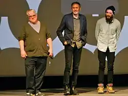 A Late Quartet was Hoffman's other film release of 2012, where he played a violinist in a string quartet whose members (played by Christopher Walken, Catherine Keener, and Mark Ivanir) face a crisis when one is diagnosed with Parkinson's disease. The drama received favorable reviews, and Stephen Holden of The New York Times called Hoffman's performance "exceptional".[131][132] In 2013, Hoffman joined the popular Hunger Games series in its second film, The Hunger Games: Catching Fire, where he played gamemaker Plutarch Heavensbee. The film finished as the 10th-highest grossing in history to that point,[133] and Hoffman became recognizable to a new generation of film-goers.[128] In January 2014, shortly before his death, he attended the Sundance Film Festival to promote two films. In Anton Corbijn's A Most Wanted Man, a thriller based on John le Carré's novel, Hoffman played a German intelligence officer. His performance was praised by Xan Brooks as one of "terrific, lip-smacking relish: full of mischief, anchored by integrity."[134] The other was God's Pocket, the directorial debut of actor John Slattery, in which Hoffman played a thief.[135] In November 2014, nine months after his death, The Hunger Games: Mockingjay – Part 1, was released, in which he had a major role. It was dedicated in his memory.[136]