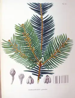 Coloured plate of Cephalotaxus pedunculata in Flora Japonica, by Philipp Franz von Siebold and Joseph Gerhard Zuccarini