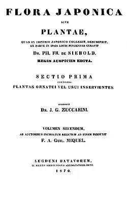Von Siebold wrote his Flora Japonica in collaboration with the German botanist Joseph Gerhard Zuccarini (1797–1848). It first appeared in 1835, but the work was not completed until after his death, finished in 1870 by F.A.W. Miquel (1811–1871), director of the Rijksherbarium in Leiden. This work expanded von Siebold's scientific fame from Japan to Europe.