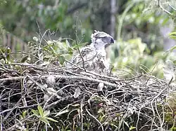 Breeding season is in July; birds on different islands, most notably Mindanao and Luzon, begin breeding at different ends of this range.[10] The amount of rainfall and population of prey may also affect the breeding season.[10] The nest is normally built on an emergent dipterocarp, or any tall tree with an open crown, in primary or disturbed forest. The nests are lined with green leaves, and can be around 1.5 m (4.9 ft) across. The nesting location is around 30 m (98 ft) or even more above the ground.[11][33] As in many other large raptors, the eagle's nest resembles a huge platform made of sticks.[4][33] The eagle frequently reuses the same nesting site for several different chicks.[11] Eight to 10 days before the egg is ready to be laid, the female is afflicted with a condition known as egg lethargy. In this experience, the female does not eat, drinks much water, and holds her wings droopingly.[34] The female typically lays one egg in the late afternoon or at dusk, although occasionally two have been reported.[33][34] If an egg fails to hatch or the chick dies early, the parents likely lay another egg the following year. Copulation may take place a few days after the egg is laid to enable another egg to be laid should the first one fail. The egg is incubated for 58 to 68 days (typically 62 days) after being laid.[4] Both sexes participate in the incubation, but the female does the majority of incubating during the day and all of it at night.[34]