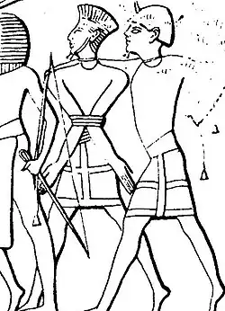 The inscriptions at Medinet Habu consist of images depicting a coalition of Sea Peoples, among them the Peleset, who are said in the accompanying text to have been defeated by Ramesses III during his Year 8 campaign. In about 1175 BC, Egypt was threatened with a massive land and sea invasion by the "Sea Peoples," a coalition of foreign enemies which included the Tjeker, the Shekelesh, the Deyen, the Weshesh, the Teresh, the Sherden, and the PRST. They were comprehensively defeated by Ramesses III, who fought them in "Djahy" (the eastern Mediterranean coast) and at "the mouths of the rivers" (the Nile Delta), recording his victories in a series of inscriptions in his mortuary temple at Medinet Habu. Scholars have been unable to conclusively determine which images match what peoples described in the reliefs depicting two major battle scenes. A separate relief on one of the bases of the Osiris pillars with an accompanying hieroglyphic text clearly identifying the person depicted as a captive Peleset chief is of a bearded man without headdress.[125] This has led to the interpretation that Ramesses III defeated the Sea Peoples, including Philistines, and settled their captives in fortresses in southern Canaan; another related theory suggests that Philistines invaded and settled the coastal plain for themselves.[126] The soldiers were quite tall and clean-shaven. They wore breastplates and short kilts, and their superior weapons included chariots drawn by two horses. They carried small shields and fought with straight swords and spears.[127]