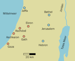 According to Joshua 13:3[117] and 1 Samuel 6:17,[118] the land of the Philistines, called Philistia, was a pentapolis in the southwestern Levant comprising the five city-states of Gaza, Ashdod, Ashkelon, Ekron, and Gath, from Wadi Gaza in the south to the Yarqon River in the north, but with no fixed border to the east.[49]