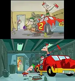Much of the series' humor relies on running gags used in almost every episode, with slight variation.[24] Certain aspects of the show's humor are aimed at adults,[17] including its frequent pop-culture references.[25] Co-creator Dan Povenmire, who had previously worked on Family Guy, sought to create a less raunchy show that would make similar use of comic timing, metahumor, humorous blank stares, wordplay and breaking the fourth wall.[18] Povenmire describes the show as a combination of Family Guy and SpongeBob SquarePants.[26] Co-creator Jeff "Swampy" Marsh has said that the show was not created exclusively for children; he simply did not exclude them as an audience.[17]