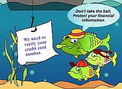 The term "phishing" was first recorded in 1995 in the cracking toolkit AOHell, but may have been used earlier in the hacker magazine 2600.[5][6][7] It is a variation of fishing and refers to the use of lures to "fish" for sensitive information.[6][8][9]