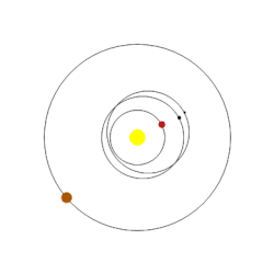 The origin of the Martian moons has been disputed.[67] Phobos and Deimos both have much in common with carbonaceous C-type asteroids, with spectra, albedo, and density very similar to those of C- or D-type asteroids.[68] Based on their similarity, one hypothesis is that both moons may be captured main-belt asteroids.[69][70] Since both moons have nearly circular orbits that lie almost exactly in Mars's equatorial plane, a capture origin for them requires a mechanism for circularizing their initially highly eccentric orbits and adjusting their inclinations into the equatorial plane, most probably by a combination of atmospheric drag and tidal forces.[71] However, it is not clear that sufficient time is available for this to occur for Deimos.[67] Capture also requires dissipation of energy. The current Martian atmosphere is too thin to capture a Phobos-sized object by atmospheric braking.[67] Geoffrey A. Landis has pointed out that the capture could have occurred if the original body was a binary asteroid that separated under tidal forces.[70][72]