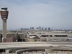 Sky Harbor's Control Tower with downtown Phoenix in the distance