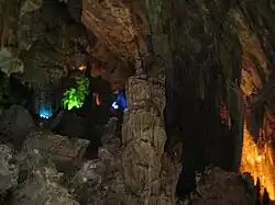 Tiên Sơn cave is located in Phong Nha-Kẻ Bàng National Park. The cave was discovered by a local inhabitant by accident in 1935.[10] It is located in Sơn Trach Commune in Bố Trạch. The entry mouth of Tiên Sơn is 1 km from Phong Nha cave, at an altitude of 200 m. This cave is 980 m (3,220 ft) in length. A 10 m-deep (33 ft) hole is situated 400 m (1,300 ft) from the entry mouth, then a 500 m-long (1,600 ft) cave, dangerous for tourists and open to professional expeditionists only. Like Phong Nha cave, this cave features spectacular stalactites and stalagmites shaped like several fairy tales. Stalactite and stalagmite columns and walls here create strange sounds like that of gong and drum if they are knocked with the hand. According to British cave scientists, Tiên Sơn cave was created tens of million years ago when a water current holed this limestone mount in Kẻ Bàng. Following a series of landforms and movement of rocks, this mass was levered or lowered, blocking the current and creating what is now Tiên Sơn cave while the underground river redirected its current to Phong Nha cave. Although Phong Nha and Tiên Sơn caves are located next to each other, there are no linking grottos between them.[30]