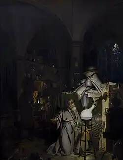 Phosphorus was the first element to be "discovered", in the sense that it was not known since ancient times.[12] The discovery is credited to the Hamburg alchemist Hennig Brand in 1669, who was attempting to create the fabled philosopher's stone.[13] To this end, he experimented with urine, which contains considerable quantities of dissolved phosphates from normal metabolism.[14] By letting the urine rot (a step later discovered to be unnecessary),[15] boiling it down to a paste, then distilling it at a high temperature and leading the resulting vapours through water, he obtained a white, waxy substance that glowed in the dark and burned brilliantly. He named it in Latin: phosphorus mirabilis, lit. 'miraculous bearer of light'. The word phosphorus itself (Ancient Greek: Φωσφόρος, romanized: Phōsphoros, lit. 'light-bearer') originates from Greek mythology, where it references the god of the morning star, also known as the planet Venus.[14][16]