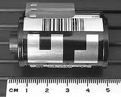 In the 1980s, Kodak developed DX Encoding (from Digital indeX), or DX coding, a feature that was eventually adapted by all camera and film manufacturers.[39] DX encoding provides information on both the film cassette and on the film regarding the type of film, number of exposures, speed (ISO/ASA rating) of the film. It consists of three types of identification. First is a barcode near the film opening of the cassette, identifying the manufacturer, film type and processing method (see image below left). This is used by photofinishing equipment during film processing. The second part is a barcode on the edge of the film (see image below right), used also during processing, which indicates the image film type, manufacturer, frame number and synchronizes the position of the frame. The third part of DX coding, known as the DX Camera Auto Sensing (CAS) code, consists of a series of 12 metal contacts on the film cassette, which beginning with cameras manufactured after 1985 could detect the type of film, number of exposures and ISO of the film, and use that information to automatically adjust the camera settings for the speed of the film.[39][40][41]
